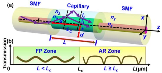 where , , and represent the refractive index of air, fiber core of SMF, and cladding, respectively. r and d denote the radius of the air core and the thickness of the ring cladding, respectively. If the capillary length is longer than Lc, the AR effect will be excited in the whole process. Otherwise, the sandwich structure only induces the FP effect. Figure 2b shows that several resonant wavelengths with a periodic distribution that is located in the AR effect-based transmission spectrum. According to the phase matching condition, the resonant wavelength can be given as follows [13]:
