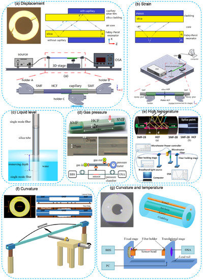 Figure 4a shows that the inner capillary is coated with silver, and then wraps the HCF [51]. This most common HCF agrees with the theory of Section 2.1, so it will form an FP cavity in the cladding. The leaky mode of the HCF actually features the resonant wavelengths in the transmission spectrum. The initial leaky mode will be reflected back into cladding with the capillary location movement because the covered part is transformed to the silica–silver interface. Thus, the intensity of the resonant wavelength is sensitive to the displacement, and it finally obtains a high sensitivity of 0.578 dB/μm. Likewise, as shown in Figure 4b, HCF is inserted into the polymethyl methacrylate (PMMA) hollow-core fiber [52]. This is a double-layer AR structure since the refractive index of PMMA is between air and silica. The distinct difference between the single- and double-layer AR structure is the free spectrum range (FSR), and the latter is larger than the former owing to the longer optical path. The tensile strain will reduce the thickness of the PMMA resulted in the optical path change, then the resonant wavelength will shift. Using this double-layer AR structure, it achieves the strain sensitivity of 27.9 pm/με. As shown in Figure 4c, the HCF is used for liquid level monitoring [53], and the sensing mechanism is similar to that in Figure 4a. The leaky mode intensity is influenced by the change of the surrounding refractive index. More specifically, the contrast of resonant wavelength will increase or decrease with the liquid level rising or falling. On the basis of this simple HCF structure, a liquid-level sensitivity of 0.4 dB/mm has been realized. Furthermore, the temperature cross-sensitivity is only 0.004 mm/°C, which can be regarded as insensitive. It is apparent that all the sensing mechanisms from Figure 4a to Figure 4c are based on the external refractive index change. On the contrary, Figure 4d devotes to the inner refractive index variation to induce the wavelength shift [54]. As displayed in Equation (2), the resonant wavelength not only depends on the silica thickness and refractive index, but also the air core refractive index. It exploits femtosecond laser drilling on the ring cladding to form a microchannel, which keeps the air-core pressure equivalent to the external environment. The manufactured part is placed into the airtight container, then the increasing pressure will induce the air core refractive index change. The gas pressure sensitivity reaches 3.592 nm/MPa by the wavelength demodulation in the range of 0 to 2 MPa. It can be seen from Figure 4a to Figure 4d, that they only cause a single parameter change in the whole sensing process, and all of these structures transfer to the refractive index variation. While temperature is treated as a sensing variable, which can simultaneously induce parameter changes in multiple structures in the AR-HCFs. As shown in Figure 4e, HCF is applied to high-temperature measurement attributed to the AR effect [55]. It is difficult to use common multimode interference for high-temperature sensing because the employed high order cladding modes have a nonlinearity variation with the temperature increasing. For the HCF, the AR effect is only dependent on the geometric size and material refractive index. Thereby, AR-HCFs have a linear relationship with temperature in a large dynamic range. Figure 4e shows a high-temperature sensitivity of 33.4 pm/°C with the working range from room temperature to 1000 °C. The sensitivities of all the aforementioned structures are determined by their own material properties. Figure 4f enhances the curvature sensitivity assisted by coating the sensitive material [56]. After the polydimethylsiloxane (PDMS) coated on the HCF, the mode confinement is reduced and bending losses are significantly higher. By the external structure modifications, it acquires the curvature sensitivity of −5.26 dB/m−1, which is several times higher than without PDMS coated. In addition, the structure modifications can be also conducted by the special design of HCF. Figure 4g illustrates a novel fiber with a single-hole twin eccentric core, which simultaneously has AR effect and inline Mach-Zehnder interference (IMMI) functions [57]. In this case, the dual or multiple parameters can be measured simultaneously based on different mechanisms and without crosstalk. A curvature sensitivity of −1.54 dB/m−1 and the temperature sensitivity of 70.71 pm/°C is realized based on the AR effect and IMMI, respectively. The listed seven examples reveal that the most common HCF mainly rely on the AR effect for sensing at present.