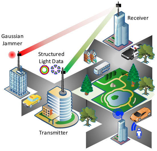 Structured light communication patterns between buildings with extrinsic Gaussian profile jammer.