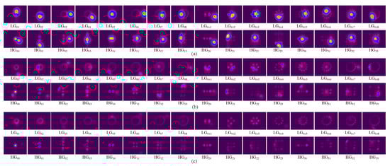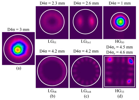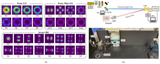 It has been shown that the distribution of laser light amplitude, in free space, can be represented, in rectangular coordinates, by the product of Hermitte polynomials , where n and m are the polynomials order, or in cylindrical coordinates by Laguerre polynomial (·), where ℓ and p are the azimuthal and radial indices, respectively [19]. In this work, the HG and LG orthogonal modes are used as code words for data transmission in an M-ary pattern coding system, where M is the modulation order of LG or HG coding system. In Figure 2a, the laboratory-generated LG and HG modes are shown, which are used to build an M-ary coding communication system with M = 8, 16, and 32. In particular, Hermite–Gaussian and Laguerre–Gaussian functions provide an exact representation of the higher-order solutions of the free space paraxial wave equation in rectangular and cylindrical coordinates, respectively [20]. The HG modes can be written in rectangular coordinates as [20], where or is the solution in x or y transverse dimension, and is given by