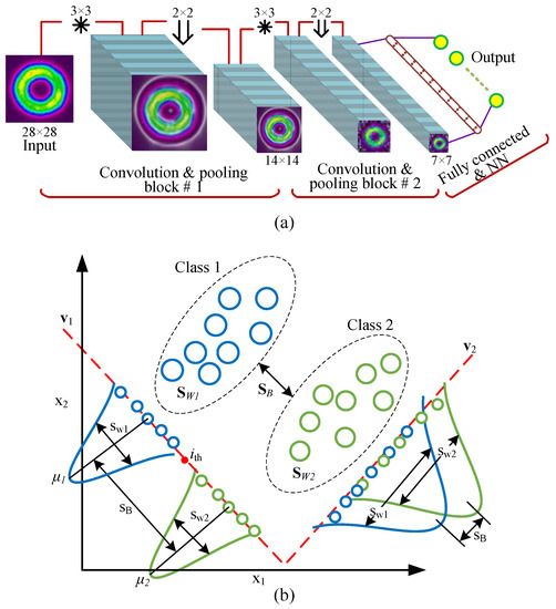 (a) CNN-based classifier architecture. (b) LDA-based classifer principles.