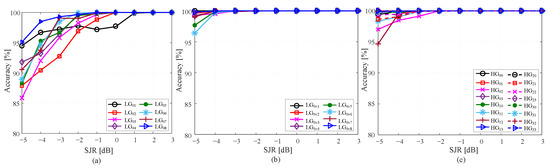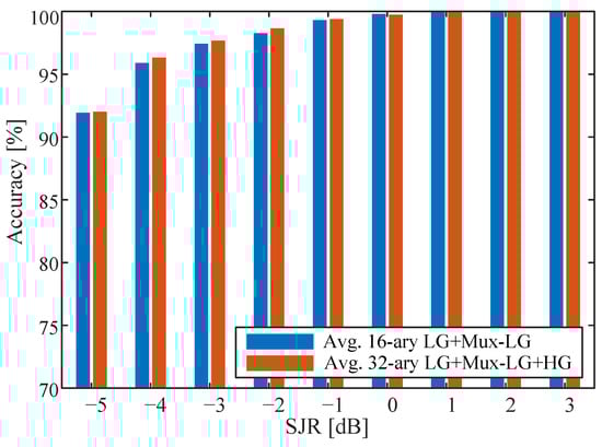 Figure 8 shows the average accuracy of 16-ary LG+Mux-LG and 32-ary LG+Mux-LG+HG modulation schemes. It can be noted that the average classification, for both modulation schemes, achieves ∼92% at −5 dB SJR. Moreover, these modulation schemes need at least 1 dB SJR to reach 100% classification accuracy. This can be explained by the high effect of the jammer on the standard LG modulation schemes. Hence, combining the standard LG modes with Mux-LG and HG patterns, to increase data transmission rate, reduces the system performance under jamming threat.
