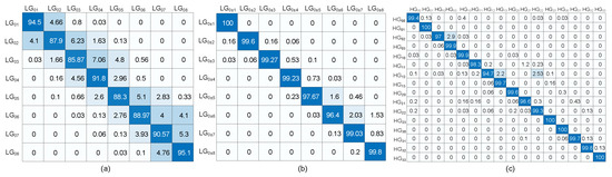 Confusion matrices for (a) 8-ary LG, (b) 8-ary Mux-LG, and (c) 16-ary at SJR of −5 dB.