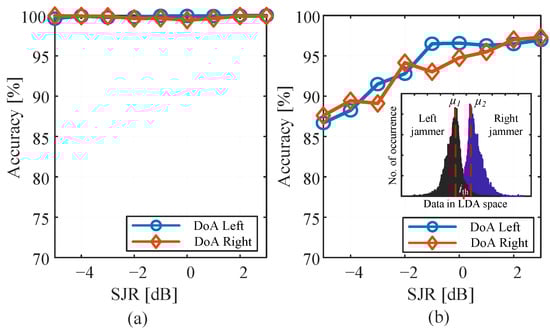 Figure 9 shows the classification performance in terms of the recognition accuracy for LDA- and CNN-based classifiers. The CNN-based method is able to identify the left and right jammer DoA with 100% accuracy for all SJRs. This could be attributed to the clear and frequent incidents of the left-hand jammer on the right-side of the received mode (see Figure 4) and the vice versa is expected for the right-hand jamming. However, exploiting LDA-based algorithm (i.e., low-complexity classifier) reduces the DoA identification to a maximum of 97% at SJR of 2 dB. Inset in Figure 9b shows the distribution of data on LDA space. It is observed that much useful information of data was preserved in 1D space, with the existence of a clear separation between the two DoA jammers, except a small region of interference. While LDA classification accuracy is less than the CNN classifier, nevertheless it gives acceptable results, especially at SJR ≥ 0 dB, where the accuracy reaches more than 95%.