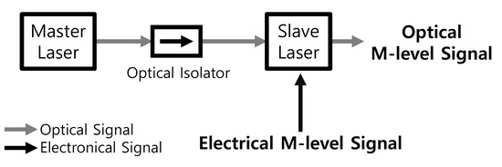 Optically injection-locked (OIL) semiconductor lasers have garnered considerable interest, as they exhibit various advantages over free-running lasers. In OIL semiconductor lasers, when light from a master laser (ML) is injected into a slave laser (SL), the output of the SL can be controlled to achieve the injection-locked state by the appropriate control of the injection locking parameters. In an OIL laser, the resonance frequency and modulation bandwidth of the SL can be improved [9,10,11,12,13]. It also exhibits improved laser performance such as reduction of mode partition noise [14], chirp [15,16,17], and nonlinear distortions [18,19]. Therefore, OIL systems are potential candidates for generating high-capacity signals for various photonic applications such as data centers, high-speed photonics integrated circuits, optical signal processing, and light detection and ranging.