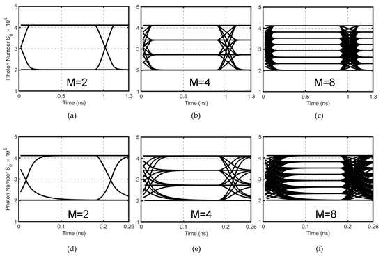 Figure 3 shows the eye patterns of the OIL semiconductor lasers modulated by M-level ASK signals. It shows the output photon numbers for various M-levels and symbol-rates. Figure 3a–c show the eye patterns of 2-, 4-, and 8-level ASK modulated signals at a 1-Gbaud data, respectively. Figure 3d–f show the eye patterns of the 2-, 4-, and 8-level ASK modulated signals at a 5-Gbaud data, respectively.