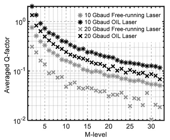 Figure 4 shows the averaged Q-factors of the free-running and OIL semiconductor lasers as a function of various M-levels for 10-Gbaud and 20-Gbaud modulation. As the level of M-value in the M-level ASK modulation increases, the Q-factor decreases in both the free-running and OIL semiconductor lasers. The Q-factor also decreases as the data rate increases. The performance of M-level modulation in terms of Q-factor improves significantly for the OIL laser as compared to the free-running laser. It shows more than two times the improvement for the OIL laser (~0.7) as compared to the free-running laser (~0.3) at 10-Gbaud data rate with 5-level modulation.