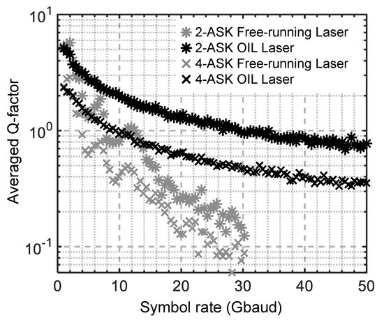 Averaged Q-factors of the free-running and the OIL semiconductor lasers as a function of various data rates for 2 and 4-level ASK signals. Q-factor: quality-factor; ASK: amplitude-shift keying; OIL: optically injection-locked.