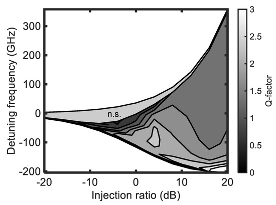 Q-factor dependence on the injection-locking parameters for two-level ASK signals at 10-Gbaud data modulation. The locking range is represented as a gray-scaled range that shows the Q-factor value. Q-factor: quality-factor; n.s.: unstable locking range.
