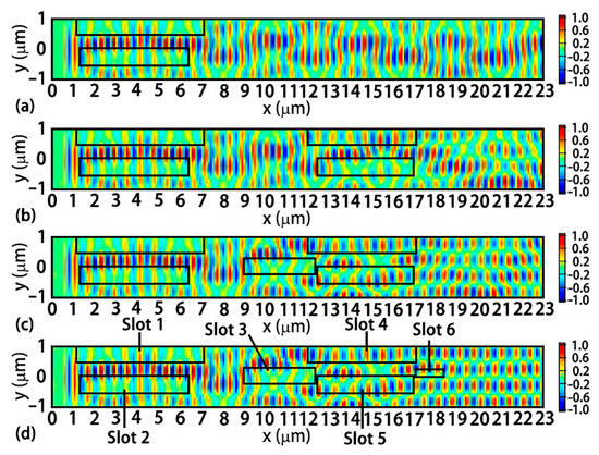 Electric field evolution (Ez component) of input TM0 mode transmitted along the silicon waveguide which was etched by (a) slots 1 and 2, (b) slots 1, 2, 4, 5, (c) slots 1~5, and (d) slots 1~6.