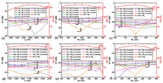 Mode CE and CT of the proposed TM0-to-TM3 mode-order converter as functions of (a) length L3, (b) width W3, (c) relative distance Ws of slot 3, and (d) length L6, (e) width W6, (f) relative distance Wm of slot 6, respectively.