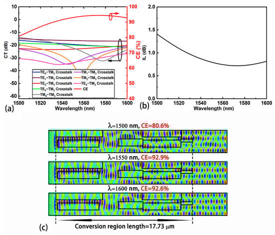 (a) Wavelength spectra of mode CE and CT of the proposed TM0-to-TM3 mode-order converter (λ = 1500~1600 nm). (b) Wavelength spectra of mode IL of the proposed TM0-to-TM3 mode-order converter (λ = 1500~1600 nm). (c) Electric field evolution through the designed device working at different wavelengths (λ = 1500, 1550, 1600 nm). Total mode conversion length was 17.73 μm.