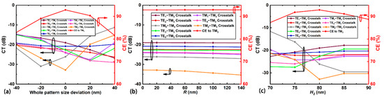 Considering the device fabrication, we only required an extra lithography and etching step on the base of the silicon waveguide to form the designed slot metasurface pattern, which will not pose huge challenges for the current fabrication facilities [33,34]. We started from the silicon-on-insulator wafer with a 300 nm-thick top silicon layer. First, a rectangular silicon waveguide with a width of 2 μm and an etching depth of 300 nm was fabricated using E-beam lithography (EBL) and reactive ion etching (RIE) [33,34]. Second, we employed EBL again to form the designed slot metasurface pattern atop the silicon waveguide and then used RIE to transfer the lithography pattern from photoresist to the silicon layer, where the etching depth was 80 nm. Note that the structural alignment between above steps 2 and 3 should be guaranteed during the fabrication process. Third, we grew an upper cladding of silicon nitride to further protect the waveguide through the plasma-enhanced chemical-vapor-deposition process [33,34]. Referring to these fabrication steps, we took some parameters into account for the tolerance analyses (whole pattern size deviation, round corner, etching depth deviation), as illustrated in Figure 5. It was noted that the whole pattern size and etching depth deviating from their optimum values revealed a strong influence on the device performance, leading to tight fabrication tolerances. So, the whole pattern size deviation should be controlled within ±20 nm by keeping mode CE > 89% and CT < −16 dB, and the allowable etching depth deviation was much smaller, only within ±5 nm by keeping mode CE > 91% and CT < −16 dB, respectively. To achieve this key etching depth, we should pay attention to the etching process, especially for the etching time and etching gas. Furthermore, owing to the proximity effect of EBL [35], sharp corners (right-angles) of the designed slot metasurface pattern will normally become round corners. Fortunately, no obvious performance deterioration could be observed from our calculations as the curvature radius R of round corners increased from 0 to 140 nm. Therefore, these results offer positive effect and guidance for practical device fabrication. Meanwhile, in order to find the transmission features of TE mode in the proposed device, we input the TE0 mode through the device length direction. The result revealed that such a device could not work at TE0 mode and we could not obtain the stable mode at the output port due to high mode CT and high IL.