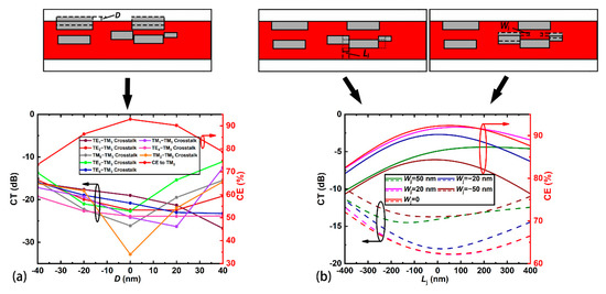Considering the structural alignment between step 2 and step 3, we analyzed the device performance dependent on the relative position shift D (in y-direction) between them as shown in Figure 6a. From the results, if the relative position shift could be controlled within the range from −20 to 20 nm, the CE could still be kept higher than 86% with CT lower than −15 dB. By contrast, if such a relative position shift was larger than ±20 nm, both CE and CT would degenerate quickly, corresponding to bad device performance. Figure 6b shows the device performance dependent on the length variation of slot 5 (Lj) and width variation of slot 3 and slot 6 (Wj), where the total lengths of slots 3, 5, and 6 were kept unchanged. To make it more clear, we only drew the curve of the highest CT. From Figure 6b, we can see that the length variation and width variation of these slots should be kept within the range from −100 to 100 nm and from –20 to 20 nm, respectively. Therefore, we should pay attention to these key device size requirements in the practical device fabrication.