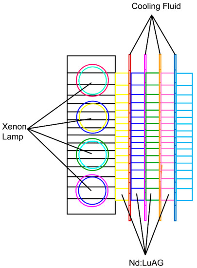 - Mangir, M.S.; Rockwell, D.A. Measurements of heating and energy storage in flashlamp-pumped Nd:YAG and Nd-doped phosphate laser glasses. IEEE J. Quantum Electron. 1986, 22, 574–580. [Google Scholar] [CrossRef]