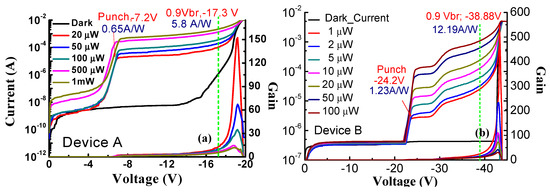Figure 3a,b shows the measured bias-dependent dark current, photocurrent, and operation gain of the demonstrated APDs, subject to different optical pumping powers at optical wavelengths of 1.31 μm and 1.55 μm for devices A and B. As can be seen, the measured Vbr and Vpt are around −19.5, −43 V and −7.2, −24.2 V for devices A and B. The smaller Vpt and Vbr of Device A is attributed to the thinner absorber layer and thicker M-layer than that of Device B. Moreover, under 0.9 Vbr operation, Device B has a higher responsivity than that of Device A which is due to the thicker absorption layer (2 versus 0.4 μm).