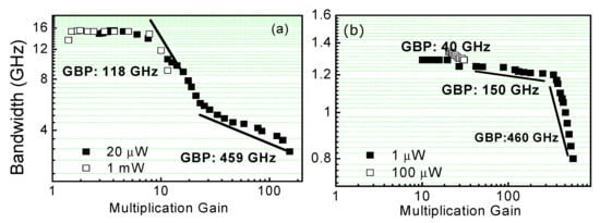 Figure 6a,b shows the 3-dB O-E bandwidth versus operation gain of Devices A and B, respectively, measured under low 20 (1) μW and high 1 (0.1) mW optical pumping power. As can be seen, for the low pumping power case, our demonstrated Device A can achieve a GBP as high as 459 GHz with a 38% unit-gain external efficiency and Device B has a GBP of around 460 GHz with a 1 A/W unit-gain external responsivity.