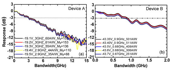 The maximum GBP values given here just follow the definitions reported for high-speed APDs [6,17] and these numbers suggest the maximum intrinsic speed of the APD [6,17]. However, for practical applications, APDs usually cannot be operated in such high-gain regions due to the increase of associated excess noise. Under 0.9 Vbr operation, the corresponding GBP values for Devices A and B are around 122 (Mg = 8.7, 14 GHz) and 42 (Mg = 33.5, 1.25 GHz) GHz, respectively. On the other hand, there is a gradual decrease in the maximum values of the GBP to 118 and 40 GHz when the optical pumping power reaches 1 mW and 100 μW, respectively, which can be attributed to the reduction in the multiplication gain versus the increase of optical power, as discussed above. The high GBP of around 460 GHz achieved in our fabricated APDs can be attributed to effect of the multiplication layer, which is thinner than the conventional APD with its uniformly thick M-layer. Thus, localization impact ionization in the M-layer (in the lower M-layer) reduces the probability of the avalanche process occurring in the whole M-layer. In addition, the overall gain in our dual multiplication layer is higher, with each layer contributing to the gain, M1 and M2. Thus, the overall gain in our structure is M1*M2 to sustain a constant bandwidth. Furthermore, compared to the gain-bandwidth curves of typical APDs, which usually exhibit monotonic decreases of bandwidth with an increase in the multiplication gain [3,17], our device curves exhibit different trends. As can be seen for Device A, under a very-high operation gain (>30), the decrease in the bandwidth versus the gain is gradually minimized; for more details, please refer to our previous work [11]. Our APD (Device B) demonstrates a constant O-E bandwidth (~1.25 GHz) over a wide range of operation gains (from 10 to ~300), which means a larger operation window. Figure 7a,b shows the corresponding O-E responses measured under high-gain and low power operation. We can clearly see, the measured bandwidths for devices A and B are pinned at around 3 and 0.9 GHz, regardless of the gain. thereby resulting in the high gain-bandwidth product, as discussed above.