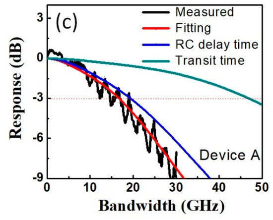 The Smith chart in Figure 9b shows the fitted and measured frequency responses corresponding to the S22 parameters for Device A. Clearly, there is a good match between the simulated and measured results. The fitted values for each circuit element in Device A are shown in Table 1. During the process of device modeling for the extraction of the extrinsic fRC of the PD chips, the two artificial circuit elements, RT and CT, are removed. This is because they are used to mimic the low-pass frequency response of the internal carrier transient time [16,20]. By choosing the proper values of RT and CT to fit the measured O-E frequency response, we can then determine the internal transient time limited frequency responses of our devices. Figure 9c shows the measured O-E, fitted O-E, RC-limited and transient time limited frequency responses. As can be seen, under −13 V, Device A has an RC-limited O-E bandwidth. A wider 3-dB O-E bandwidth can be expected by further downscaling of the active diameter.