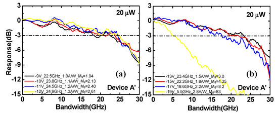Figure 12a,b show the bias dependent O-E frequency responses of Device A′ measured under a high input optical power (1 mW). As can be seen, Device A′ behaves same as Device A. The maximum 3-dB O-E bandwidths are pinned at around 25 GHz, regardless of the changes in the reverse bias voltage. It is worth mentioning that under both low and high gain, our back side illuminated Device A′ has 6–8 GHz higher bandwidth compared to the top illuminated Device A.