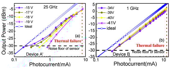 Figure 13a,b shows the dc output photocurrent versus the input optical power for Devices A′ and B, respectively. As can be seen, the dc saturation current of Device A′ is higher than that of Device B (5 versus 3 mA) at near Vbr bias, due to the thinner depletion layer thickness. The output saturation power of our demonstrated APD is tested using a two-laser heterodyne-beating setup at the 1550 nm wavelength. Figure 14a,b show the measured photo-generated radio frequency (RF) power versus output photocurrent obtained under different reverse biases. The measurement frequency was selected to be around the 3-dB O-E bandwidth for both Devices A′ and B at 25 GHz and 1 GHz, respectively. The ideal relation between the microwave power and averaged photocurrent (open symbol), with a 100% optical modulation depth under a 50 Ω load, is also plotted for reference.