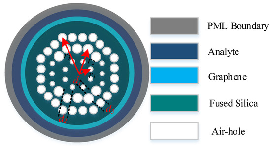 Figure 1 shows the cross-section of the proposed PCF-based SPR sensor, which consisted of an optical fiber of 10 μm of a diameter having three rings (air holes) arranged with octagonal lattice. All air holes of the 1st ring were positioned at r1 = 0.5 μm from the core of the PCF. Furthermore, all corner air holes of the 2nd and 3rd ring are placed at r2 = 1 μm, and r3 = 1.5 μm, respectively, then the other air holes were positioned perfectly to obtain an octagonal lattice structure. The diameter of the air holes, named d1, d2, d3 in Figure 1, were set to 0.2 μm, 0.4 μm, and 0.3 μm, respectively. The small size of the air holes with a diameter d1 increased the coupling energy between the propagating mode of PCF and the surface plasmon polariton (SPP) mode, which were excited in the graphene layer. We used fused silica as the fiber material, which is characterized by the Sellmeier equation [41]: