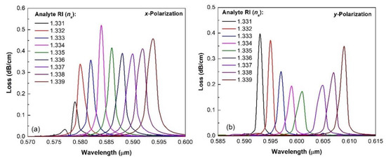 For determining the performance of the sensor, the RI of the analyte was varied from 1.331 to 1.339 and the confinement loss spectra for the x and y polarization were plotted, as shown in Figure 3a,b. These figures present the confinement losses for a configuration with a graphene layer with a thickness of 36.72 nm (108 layers as the thickness of each graphene layer is 0.34 nm [5,45]). From these results, the values of confinement loss vary from 0.1628 dB/cm to 0.5208 dB/cm for the x polarized mode, while the resonance wavelength moves from 0.579 µm to 0.594 µm. In a similar way, the confinement loss lies in the range of 0.3975–0.1731 dB/cm for the y polarized mode, and the resonance wavelength changes from 0.593 µm to 0.609 µm. All these data are summarized in Table 2. As mentioned earlier, graphene exhibits very low optical losses which can be noticed in Figure 3. Likewise, the peak in the loss spectrum moves towards the higher wavelength when analyte RI is increased in both cases (for x and y polarization). The shift in the resonant wavelength occurs due to the change in the analyte RI, which modifies the phase matching point between the core guided mode and the SPP mode. Consequently, the resonance condition appears at a different wavelength.