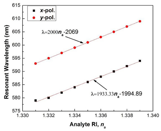 where Δλpeak is resonance wavelength shift and Δna represents the change in the analyte RI. The loss peak wavelengths are found of 0.579, 0.580, 0.582, 0.584, 0.586, 0.588, 0.590, 0.592, and 0.594 μm for the x polarization mode. On the other hand, the resonance wavelengths were obtained for 0.593, 0.595, 0.597, 0.599, 0.601, 0.603, 0.605, 0.607, and 0.609 μm for the y polarization mode. These data are summarized in Table 2. Interestingly, we observe the same amount of resonance wavelength shift, which is 0.002 μm, for the y polarized mode due to the analyte change of 0.001 RIU. Hence, we can claim that our proposed sensor exhibits identical linearity in terms of resonance wavelength. For x polarized mode, the resonance peak also shifted 0.002 μm each time except for 1.332 while the peak shift was 0.001 μm. The summary results are illustrated in Figure 4. There, we compared the sensitivity for both polarizations. The proposed sensor was more sensitive for y polarization, which was due to the fact that the plasmon mode presents a higher coupling with the core mode polarized in the y direction. Thus, this configuration reaches a sensitivity of 1933.33 and 2000 nm/RIU for x and y polarization, respectively.