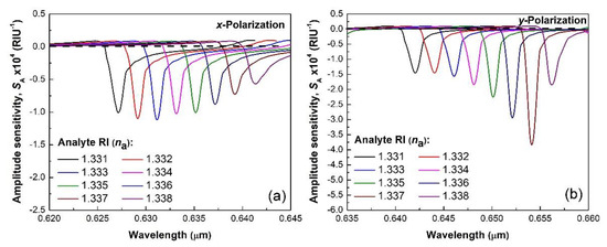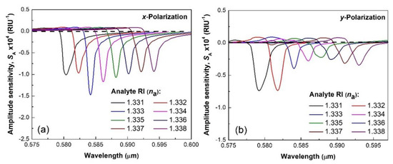 where α(λ, na), is the confinement losses and na the analyte refractive index. By using this equation, the SA was calculated and plotted in Figure 5. The maximum amplitude sensitivity values for the proposed sensor are 14,847.03RIU−1 at analyte RI of 1.333 and 7351.82 RIU−1 at analyte RI of 1.331 for the x and y polarized modes, respectively. The results achieved by this design are higher than those reported in [1,2,4,5] because the surface plasmon excitation in graphene is more strongly confined than that of the conventional plasmonic material, as the nature of collective excitations in graphene is two dimensional. Since the SA is proportional to the difference between the losses of two successive analyte RI and is divided by the loss corresponding to lower analyte RI, the value of amplitude sensitivity is much higher than that of the conventional metals because the ohmic and radiative loss are much lower in graphene.