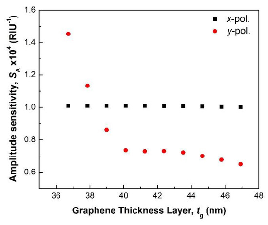 Figure 8 describes the amplitude sensitivity as a function of graphene layer thickness. The amplitude sensitivity decreases when the thickness of the graphene layer increases for both x and y polarized modes. The amplitude sensitivity was observed when the graphene layer thickness was maintained at 36.72, 37.85, 38.99, 40.12, 41.25, 42.39, 43.52, 44.65, 45.79, and 46.92 nm corresponding to 108, 111, 115, 118, 121,125, 128, 131,135, and 138 layers, respectively. For the x polarized modes, the observed values of amplitude sensitivity are 10,095.8 RIU−1, 10,097.4 RIU−1, 10,096.9 RIU−1, 10,094.9 RIU−1, 10,089.7 RIU−1, 10,080.9 RIU−1, 10,070.2 RIU−1, 10,055.1 RIU−1, 10,034.0 RIU−1, and 10,010.1 RIU−1, respectively. Similarly, the observed values of amplitude sensitivity for the y polarized mode are 14,530.3 RIU−1, 11,334.8 RIU−1, 8609.9 RIU−1, 7362.0 RIU−1, 7294.2 RIU−1, 7309.7 RIU−1, 7215.1 RIU−1, 7001.0 RIU−1, 6770.8 RIU−1, and 6500.4 RIU−1, respectively. For both polarization modes, the amplitude sensitivity decreases with an increasing graphene layer thickness, because of the reduction in the strength of the surface plasmon wave (SPW). However, the variation for y polarization is bigger in comparison with the obtained results for x polarization.
