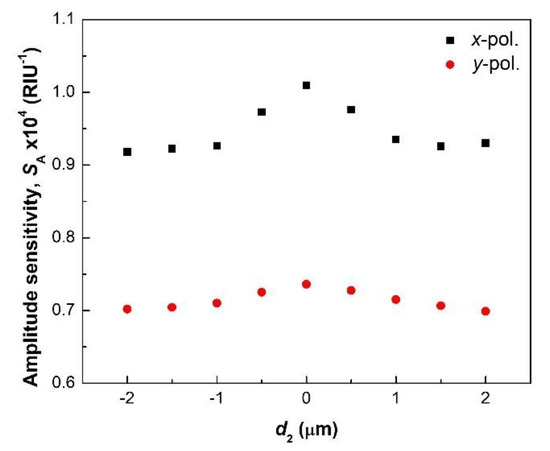 Amplitude sensitivity as a function of d2. Black points (square shape) and red points (circular shape) show the obtained results for x and y polarized modes.