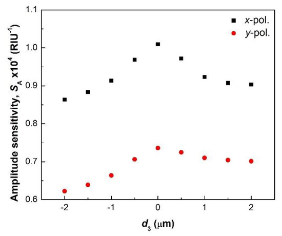 Amplitude sensitivity as a function of d3. Black points (square shape) and red points (circular shape) show the obtained results for x and y polarized modes.