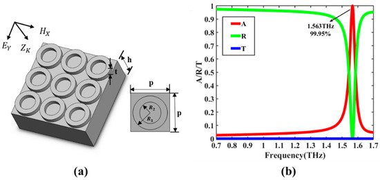 The stainless steel THz absorber schematic diagram is shown in Figure 1a. The structure is mainly composed of a metal metamaterial layer and a substrate layer. The shape of the metal metamaterial layer is a ring. The outer radius R1 and inner radius R2 of the ring are 80 µm and 60 µm, respectively. The thicknesses of the metal metamaterial layer and the substrate layer are respectively denoted by t and h, where t is 30 µm and h is 200 nm. The unit cell period p of the absorber is 170 µm. Both the metal metamaterial layer and the substrate layer are made of stainless steel with an electric conductivity of 1.4 × 106 S/m. In this work, we chose stainless steel instead of the usual gold, silver, and aluminum, because stainless steel as an alloy metal has the advantages of corrosion resistance and high hardness. In addition, as a kind of material of 3D printing, stainless steel makes it possible to realize our absorber through simple manufacturing technology. The electromagnetic simulation software CST was used to calculate the numerical absorption using the frequency domain solver. In the simulation, the unit cell boundary condition was arranged in both x and y directions, and an open boundary condition was used in the wave propagation direction. The wave vector k of the incident electromagnetic wave was assumed to be a plane wave, propagating along the negative z-axis. We defined the electric field transverse along the x-axis as the TE mode and the magnetic field transverse along the x-axis as the TM mode. In our study, simulation results were obtained under TM mode as shown in Figure 1a. The absorption (A) can be calculated as A(w) = 1 − R(w) − T(w), where T and R are the transmittance and reflectivity of the absorber, respectively. The thickness of the continuous stainless steel substrate layer as the metallic ground plate used here is much larger than the typical skin depth approximately 150 nm in the terahertz band; therefore, no transmission could be examined. Consequently, the absorption can be written as A(w) = 1 − R (w).