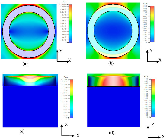 In order to explain the principle of the absorption peak generated by this absorber more vividly, we analyzed the electric and magnetic field distribution at the resonant frequency 1.563 THz. Figure 2a,b show the electric and magnetic field distribution of the stainless steel absorber on the upper surface of the ring and Figure 2c,d show the electric and magnetic field distribution of the stainless steel absorber at the ring x-z cross-section at 1.563 THz, respectively. As can be seen from Figure 2a,b, there is strong electric and magnetic field enhancement at the ring’s edge. Figure 2c,d show that the electric and magnetic field is focused primarily on the air slot of the ring metamaterial layer. The local enhancement of electric and magnetic fields indicates strong electrical and magnetic resonances [35,36]. The resonance mode can be obtained by the decomposition of dipole scattered powers [37]. Electric dipole P and magnetic dipole M mainly contribute to the resonant peak. In addition, the air slot of the ring increases the coupling of electromagnetic waves to achieve strong peak absorption. In summary, the combination of electrical and magnetic resonances produces a strong peak absorption at 1.563 THz.