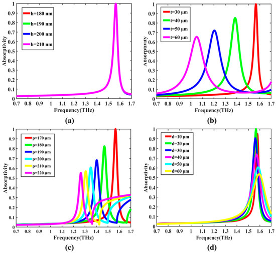 Then, we plotted the absorption spectrum to assess the influence of the value of the period p. The absorption curve when p is 170, 180, 190, 200, 210, and 220 µm is shown in Figure 3c. When p increases, the absorption peak shifts significantly to the left, and the peak value decreases. This is because when period p increases, the volume occupied by the ring metamaterial layer decreases, causing the electrical and magnetic resonance to weaken. It is worth noting that when the absorption peak shifts to the left, there a lack of flatness after the absorption peak. In the case of p = 170 μm, the phenomenon of the lack of flatness after absorption peak also exists, which is not shown in the frequency band. The uneven effect is caused by the other resonance modes. Finally, we define d, which represents the difference between radii and of the ring of the metal metamaterial layer. In our simulation, outer radius R1 does not change, keeping the value of 80 μm; only the inner radius R2 is changed to realize the change of d. The absorption curve when d is 10, 20, 30, 40, 50, and 60 µm is shown in Figure 3d. When d increases, the absorption peak shifts first to the left and then to the right, and the peak increases first and then decreases. The change in the resonant peak is due to the variation in the space occupied by the air slot, which has an influence on the coupling of electromagnetic waves inside the structure. It is found that the absorption peak is the highest when d = 20 µm. In order to obtain high absorption in the THz region and make the absorber have narrower broadband for subsequent refractive index sensing, the optimized parameters of the stainless steel absorber presented in this paper were found to be p = 170 µm, t = 30 µm, h = 200 nm, d = 20 µm.