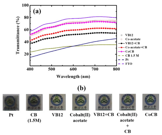(a) Transmittance spectra and (b) photographs of various CEs.