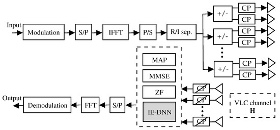 Deep learning (DL) has had an enormous impact on various research fields over the last couple of years; it has been applied in wireless communication since then [20,21,22,23]. Many researchers have already suggested DL solutions to wireless communication problems, e.g., modulation detection and signal detection [24]. VLC channel models, similar to radio frequency channel models, have been developed according to probability and signal processing theories. Furthermore, DL techniques have recently made a number of advancements in the VLC system. Since the VLC transmission must be able to support a variety of constraints, such as dimming and lighting, according to user preferences in practical applications, the implementation of DL becomes more challenging. In [25], a data-driven approach based on DL was proposed to predict the outage events in a line-of-sight link. In [23], DL-based constellation design scheme for MIMO-VLC systems was introduced, which can significantly reduce complexity compared to existing schemes while maintaining a near-optimal performance. Despite a wide range of promising applications, the performance of VLC systems has been impaired by the high SNR required to achieve a low error rate for a variety of scenarios. Therefore, DL approach can be applied to VLC systems to improve performances in practical high-speed and low error-rate indoor transmission application, such as hospital facility. To the best of the authors’ knowledge, no researcher has used DL to improve the BER performance of the GLIM-OFDM system.