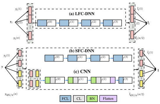 To consider the BER and computational complexity of different network structures and parameters for the active LED IE, three IE-DNN structures are considered. The three IE-DNN structures are constructed with an LED-based fully connected DNN (LFC-DNN), a subcarrier-based fully connected DNN (SFC-DNN), and a convolutional neural network (CNN), respectively. The DNNs contain several sub-blocks that are sequentially connected (the so-called hidden layers). The three IE-DNNs are presented in Figure 2.