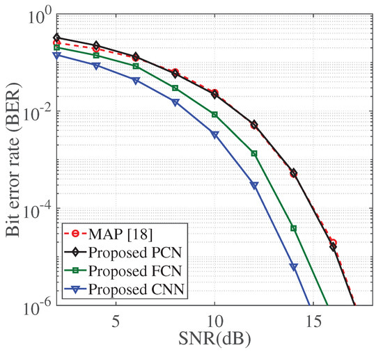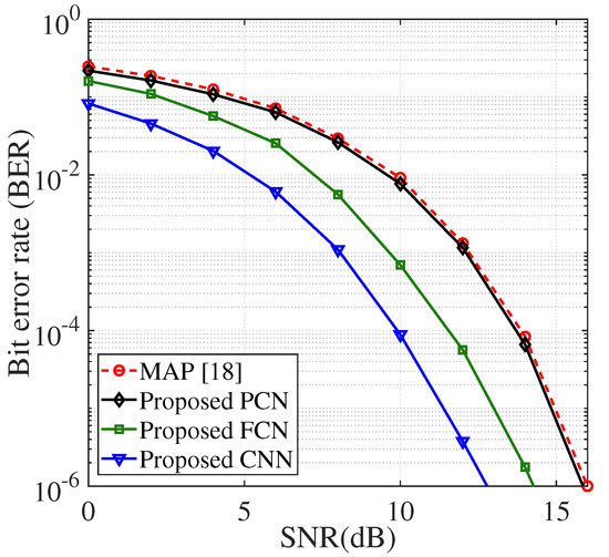 The same observation is made in Case 2. In Figure 5, the CNN-based estimator achieves an SNR gain of approximately 3 dB, and SFC-DNN achieves an SNR gain of only 2 dB. More specifically, the proposed PCN provides a same performance with the conventional MAP detector in almost all SNR regions, except the SNR value between 0 and 5 dB. Additionally, in comparison with Case 1, due to a large number of employed subcarriers, an additional SNR increment of around 3 dB is required to maintain same value of BER. Therefore, the performance observed in all figures demonstrates the advantage of the proposed detector over the conventional MAP detector in terms of error rate performance, which is most important to the reliability of VLC systems.
