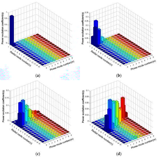 The modal power distributions under various excitation conditions (by varying the tilt angle θ of the Gaussian beam): (a) θ = 0°; (b) θ = 0.2°; (c) θ = 0.5°; (d) θ = 1°.