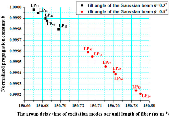 The normalized propagation constant b varies with the group delay time of excitation modes per unit length of fiber by using Equations (27) and (28) for the tilt angle θ = 0.2° and 0.5° of the Gaussian beams, as shown in Figure 2. It is obvious that the normalized propagation constant b of the low-order modes is larger than that of the higher-order modes. In addition, with an increase in the tilt angle of the Gaussian beam, the maximum delay difference between excitation modes becomes larger, which contributes to the reduction in speckle contrast.