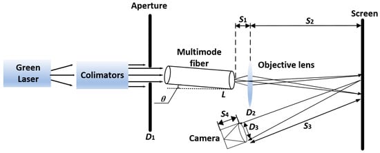 To verify the theoretical results shown above, an experimental setup based on the speckle contrast at the output of a multimode fiber under various excitation conditions (by varying the tilt angle of the Gaussian beam to θ = 0.2°, 0.5°, and 1°) was created, as illustrated in Figure 3. Multimode fibers of total length L = 2, 4, 7, 10, 15 and 20 m with a core diameter 2a = 200 µm and NA = 0.37 were used. A collimated green laser (λ = 0.53 µm) was incident on aperture D1 = 1.3 mm, followed by a laser beam into the multimode fiber. One end of the fiber was mounted on a rotational stage so that the incident beam has a tilt angle θ relative to the optical fiber axis, and the other end was clamped by the optical fiber holder to ensure parallel output relative to the fiber axis. Subsequently, the output light of the multimode fiber was imaged on a screen through an objective lens with an aperture of D2 = 50 mm and was finally captured by a Charge-coupled Device (CCD) camera.