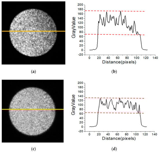 Figure 4 shows the speckle patterns and their one-dimensional (1D) intensity distributions when the incident angles of the Gaussian beam θ = 0.5° and 1° with a multimode fiber of length L = 7 m. As illustrated in Figure 4, as the tilt angle of the Gaussian beam was increased from θ = 0.5° to θ = 1°, the speckle contrast was reduced significantly and the speckle grain size became smaller. It can be clearly seen from the significant reduction in 1D intensity fluctuations that were extracted from the yellow line of the speckle patterns. This can be explained by the fact that, as the tilt angle of the Gaussian beam is increased, the modal power is transferred to higher-order modes and the maximum delay difference between excitation modes becomes larger. At this point, the inter-mode interference effect is effectively weakened. Therefore, the speckle contrast at the output of the multimode fiber is significantly reduced.
