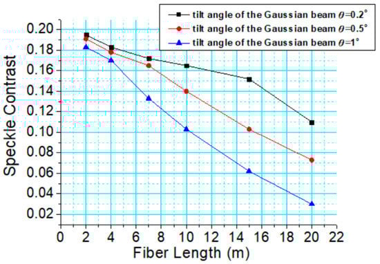 According to the theoretical simulation and calculation, when the tilt angle of Gaussian beams is 0.2°, 0.5° and 1°, the required length for significant speckle reduction is L = 16.7 m, 7.9 m and 5.3 m, respectively. As illustrated in Figure 5, for the tilt angle of Gaussian beams is 0.2°, 0.5° and 1°, significant reduction in speckle contrast (steep curves segment) corresponding to the position range of fiber lengths are within 15 m–20 m, 7 m–10 m and 4 m–7 m. It can be concluded that for the larger tilt angle of the Gaussian beam, only a shorter optical fiber is required to reduce the speckle contrast significantly.