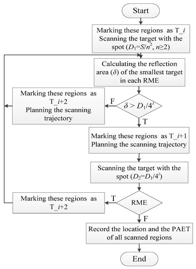 Step 1. Rough scanning. For the target with the area of S, set the scanning step of this region, i.e., T_i, where T is the flag of scanning order, and i is the i-th scanning step. Using the scanning spot with the area of D1 = S/n2 (n is the number of the sub-region of the target, n ≥ 2) to scan the target, shown in Figure 3a. Then the waveform processing and pulse extraction are carried out on the echo signal of each region received by the detector [31].