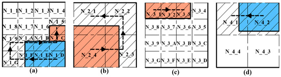 (a–d) The divided sub-regions and scanning trajectories of the region N_1–N_4.