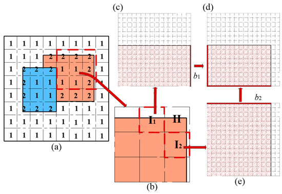 Step 4. Corner region filling. The region marked as II is divided into m × m sub-regions. The row and column of the adjacent region are regarded as the boundary of the region to be filled. Such as region II showed in Figure 6b, the number of rows and columns (b1, b2) obtained from the two adjacent regions (I1, I2) is used as the boundary of the filled region to fill region II. The filling result is shown in Figure 6d.
