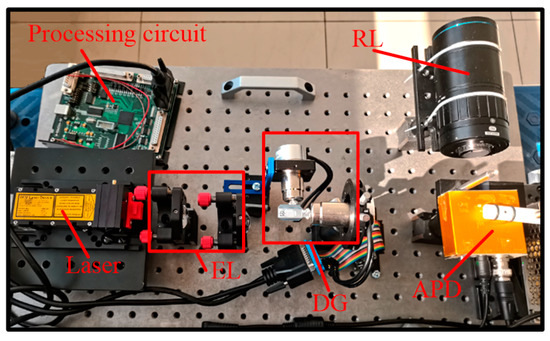 The experimental setup is shown in Figure 8. A summary of the system parameters is listed in Table 1. The laser passes through the emission lens (EL), and the spot of the emission laser is expanded. The expanded laser is projected onto the surface of the target via a dual galvanometer (DG) which scans the target area directing the emission laser in the x and y planes. The laser pulse reflected by the target passes through the receiving lens (RL) and is received by APD.