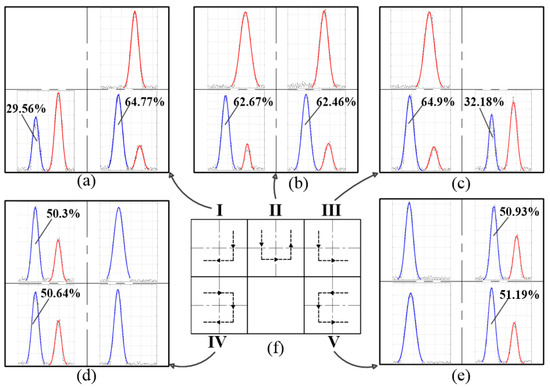 (a–e) Echo signals and PAETs of each sub-region. (f) The scanning trajectories of each sub-region in (a–e).
