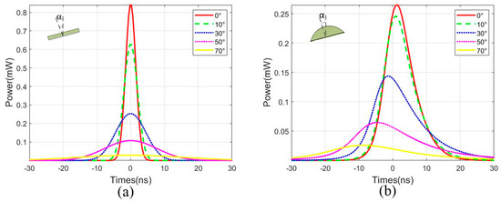 Meanwhile, in our previous research, we found that when the scanned target is curved and the target surface rotates, its echo peak, the center position of the echo, and the pulse width are changed [33]. We analyze the echo of the plane target and spherical target with a diameter of 180 mm. The echoes of the plane and sphere rotating at different angles are shown in Figure 15.